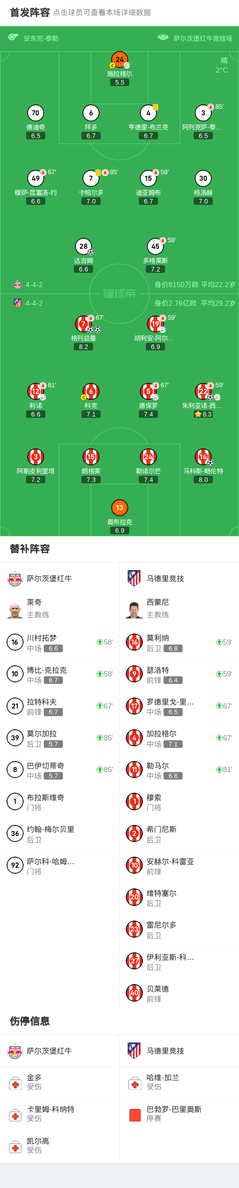 在欧洲冠军联赛的这场激烈比赛中,马德里竞技迎战萨尔茨堡红牛。比赛一开始,双方队长挑边,比赛正式开始。第5分钟,阿尔瓦雷斯送出一记精准助攻,西蒙尼劲射破门,为马德里竞技率先取得领先。这个进球让主队士气大增,给了他们更多的信心。